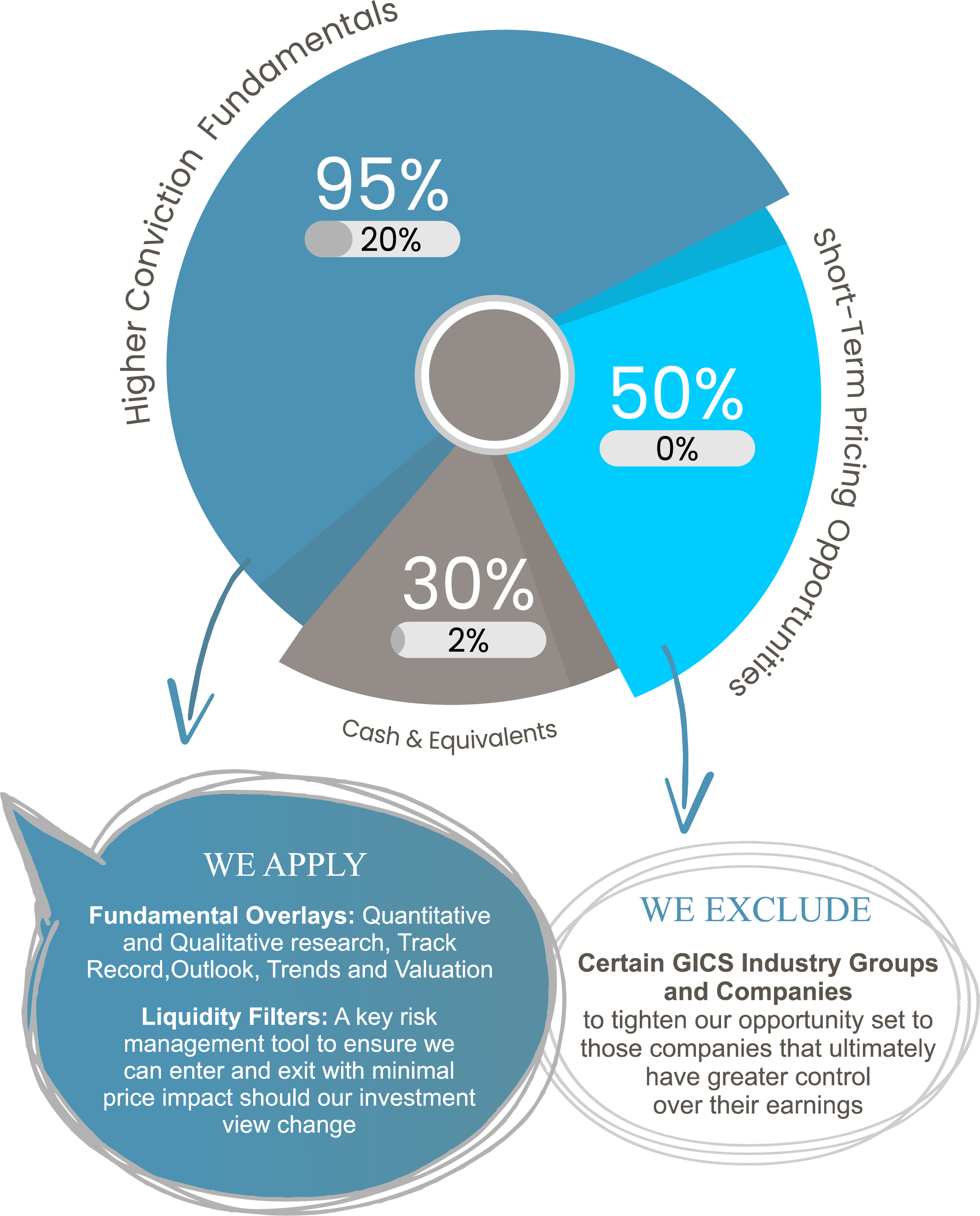 Markets don’t always behave rationally. Even outstanding companies can trade at premiums to fair value. We actively manage these positions, realising value when share prices fully reflect future growth potential.
